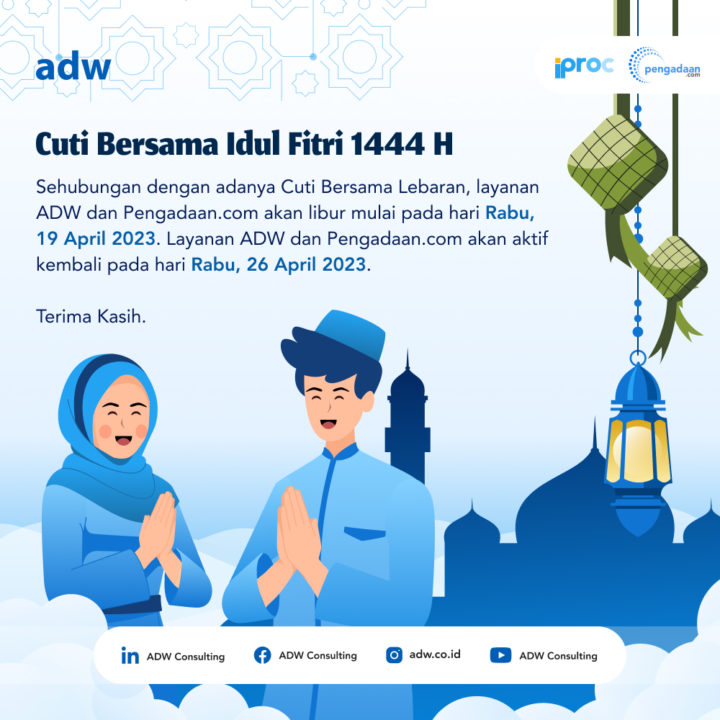 Sehubungan dengan adanya Cuti Bersama Hari Raya Idul Fitri 1444H, layanan ADW dan Pengadaan.com akan libur mulai hari Rabu, 19 April 2023 dan akan aktif kembali mulai hari Rabu, 26 April 2023. Selamat berlibur dan selamat mudik sahabat ADW!