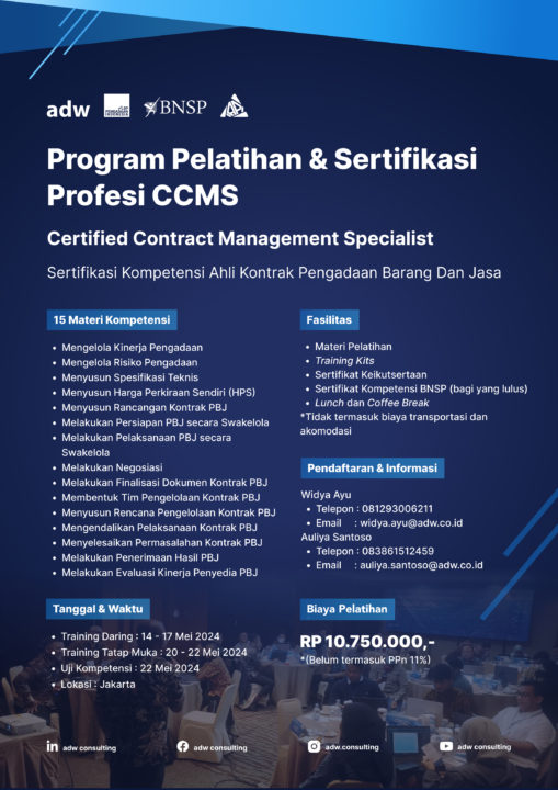 SALAM PENGADAAN! Kemampuan merencanakan dan menyusun strategi jangka panjang dalam proses pengadaan barang dan jasa tentunya sangat dibutuhkan oleh SDM pengadaan. Karena dengan strategi pengadaan yang tepat, dampak terhadap penghematan biaya dan tercapainya efektivitas bisnis akan terlihat secara signifikan. Menyadari bahwa unsur SDM yang kompeten merupakan kunci keberhasilan pada proses pengadaan, ADW Consulting berinisiatif menyelenggarakan […]