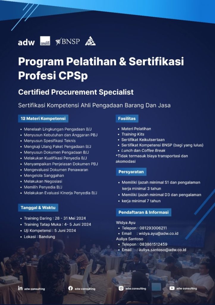 SALAM PENGADAAN Saat ini fungsi pengadaan telah berkembang menjadi fungsi yang memegang peran penting di sebuah institusi. Peran pengadaan diharapkan dapat berkontribusi langsung pada pencapaian tujuan strategis sebuah institusi. Untuk mengoptimalkan kinerja fungsi strategis pengadaan di setiap organisasi, dibutuhkan sumber daya yang mampu berfikir strategis dan memiliki kompetensi yang bisa diandalkan, sehingga mampu memberikan kontribusi […]