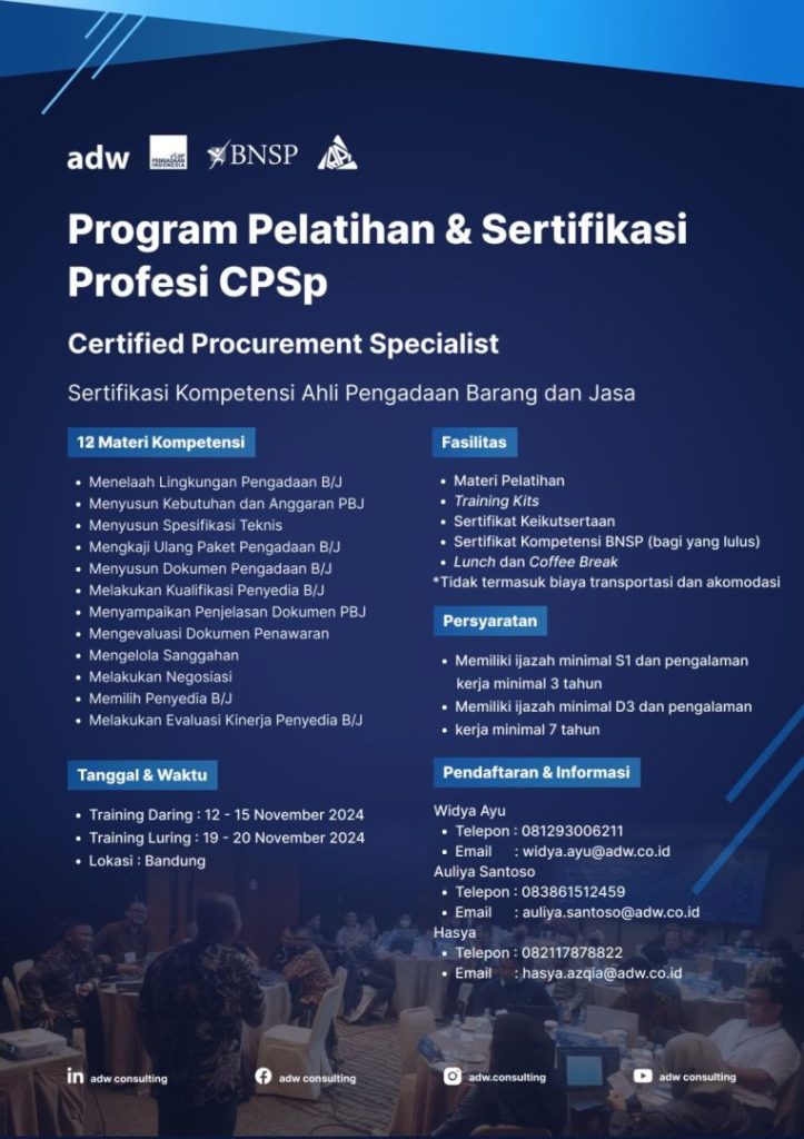 Pada bulan September 2023 lalu, adw consulting sukses menyelenggarakan acara pelatihan dan sertifikasi Certified Procurement Specialist (CPSp). Acara ini dihadiri oleh sejumlah peserta dari berbagai latar belakang industri yang berbeda. Tujuan utama dari pelatihan ini adalah untuk meningkatkan pemahaman dan keterampilan para peserta dalam manajemen pengadaan barang dan jasa. Dalam rangkaian pelatihan yang intensif, peserta […]